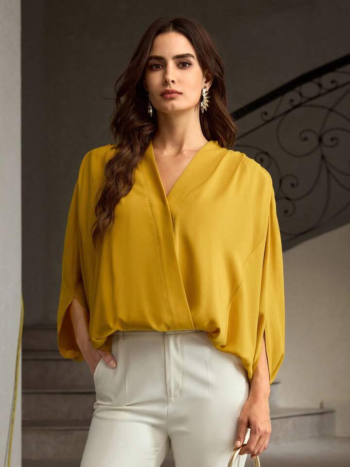 CM-TS845584 Women Elegant Seoul Style V-Neck Half Sleeve Mulberry Silk Sculptural Blouse - Yellow