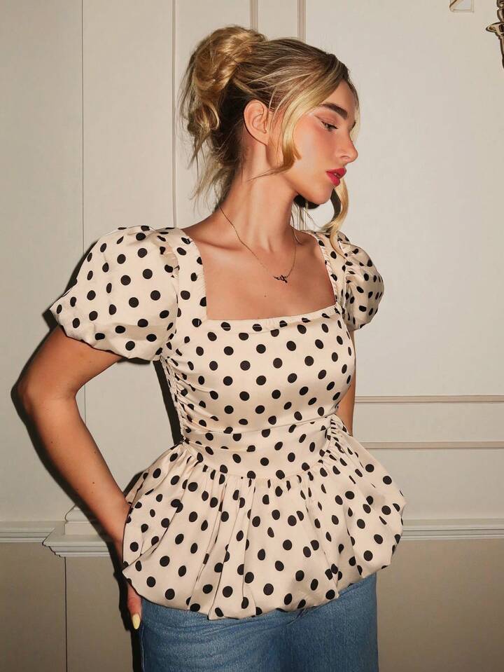CM-TS922820 Women Casual Seoul Style Satin Square Neck Short Gathered Sleeve Polka Dot Slim Fit Peplum Blouse - Apricot